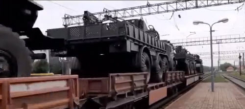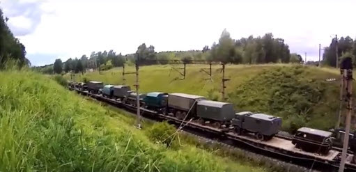 The first brief video shows at least four different trainloads of armor heading into Ukraine:
