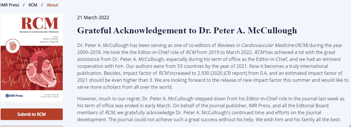 I was terminated as the Editor-In-Chief of Cardiorenal Medicine and Reviews in Cardiovascular Medicine after years of service and rising impact factors. There was no phone call, no board meeting, no due process. Just e-mails or certified letters. Powerful dark forces are working in academic medicine to expunge any resistance to the vax.
