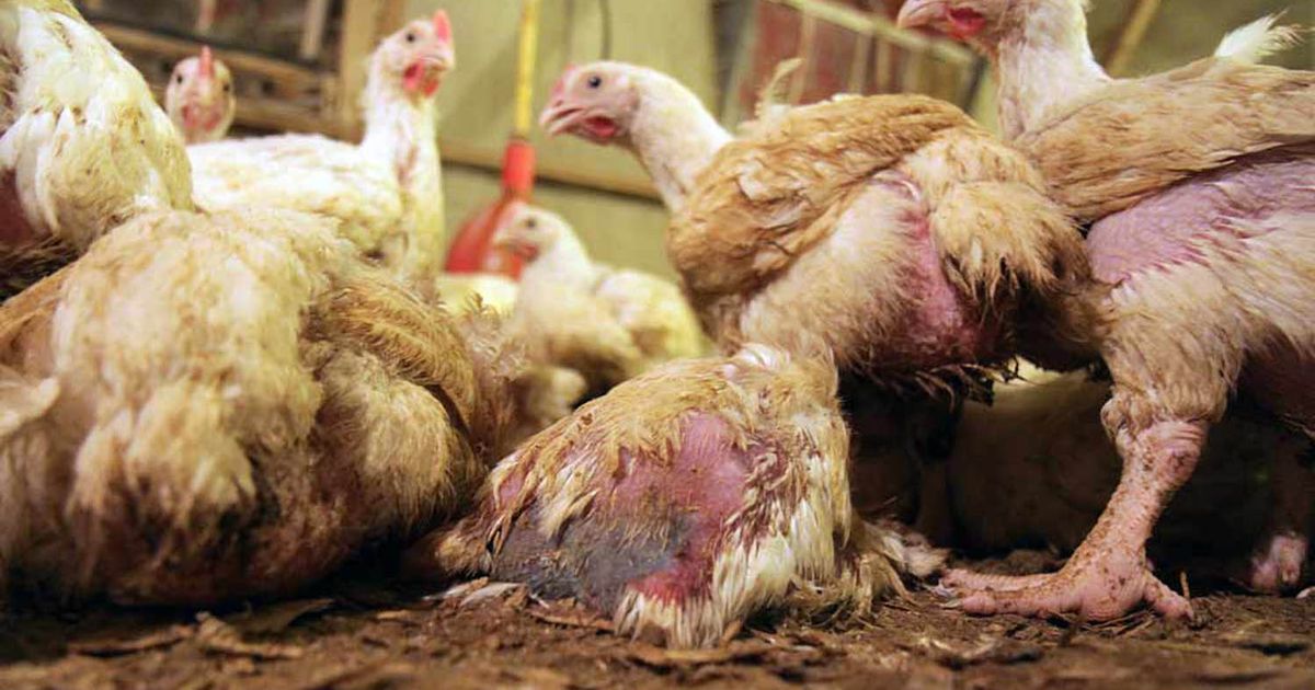 Crowded together in cramped cages, factory farmed animals often cling together with their own droppings. Animal waste is a primary source of infectious bacteria such as E. coli and salmonella, which also affect the human population through contaminated food and water. Grain-rich feed can also increase bacterial and viral loads in confined animal waste.