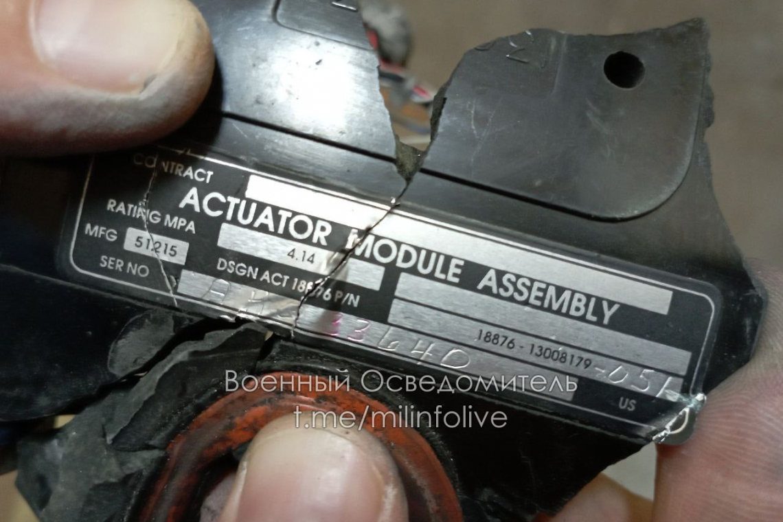 A fenti képen egy amerikai GMLRS rakéta "Actuator" robbanótöredéke látható, amelyet az atomerőmű területén történt csütörtöki robbanás után találtak meg. Az angol nyelvű Actuator gyártási címkéjén az alkatrészszám, a sorozatszám, a gyártás dátuma és a "Actuator Module Assembly" felirat szerepel.