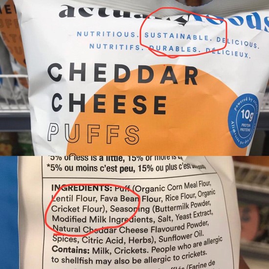 Az őrölt tücsökfehérjét becsempészik az élelmiszerboltokban árult feldolgozott élelmiszerekbe, a tücsök összetevői a zacskó elején a "fenntartható" feliratot viselik, míg a hátoldalon apró betűvel az áll: "A kagylóra allergiás emberek allergiásak lehetnek a tücsökre is".