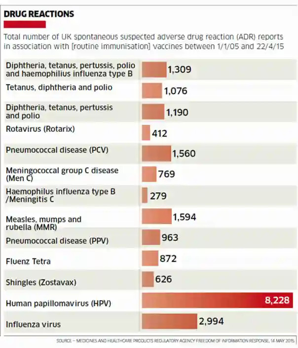 A drog 2006-os bevezetése óta a közvélemény sok ilyen tényt kemény úton tanult meg. Eddig 15 037 lány jelentette be hivatalosan a Gardasil káros mellékhatásait a Vaccine Adverse Event Reporting System (VAERS) számára. Ezek a mellékhatások közé tartozik a Guilliane Barre, a lupus, a görcsrohamok, a bénulás, a vérrögök, az agygyulladás és sok más. A CDC elismeri, hogy 44 halálesetről számoltak be.