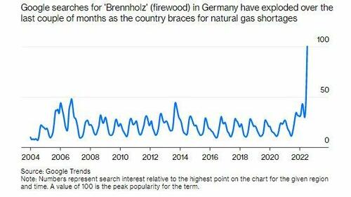 Néhány héttel ezelőtt beszámoltunk arról, hogy a Deutsche Bank előrejelzése szerint az elképesztő európai gáz- és villamosenergia-árak közepette egyre több német háztartás fog tűzifával fűteni, és ez az előrejelzés úgy tűnik, hogy önbeteljesítő lett, mivel a tűzifára ("brennholz") vonatkozó német Google-keresések azóta robbanásszerűen megugrottak: