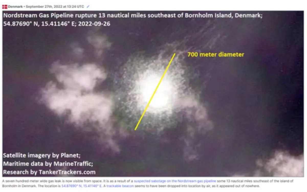 Néhány órával ezelőtt (hétfő este) az Északi Áramlat 2, az Oroszországot és Németországot összekötő tenger alatti gázvezeték nyomása lezuhant, és gázbuborékok kezdtek szivárogni a Balti-tengerbe a dán Bornholm sziget közelében. Kevesebb mint egy órája jelentették a nyomásesést ***MINDkét*** Északi Áramlat 1. és 2. vezetékben !!! ! A fenti képet katonai helikopterrel készítették az egyik szakadás helye felett, melyen a tenger felszínére buborékoló gáz látható.