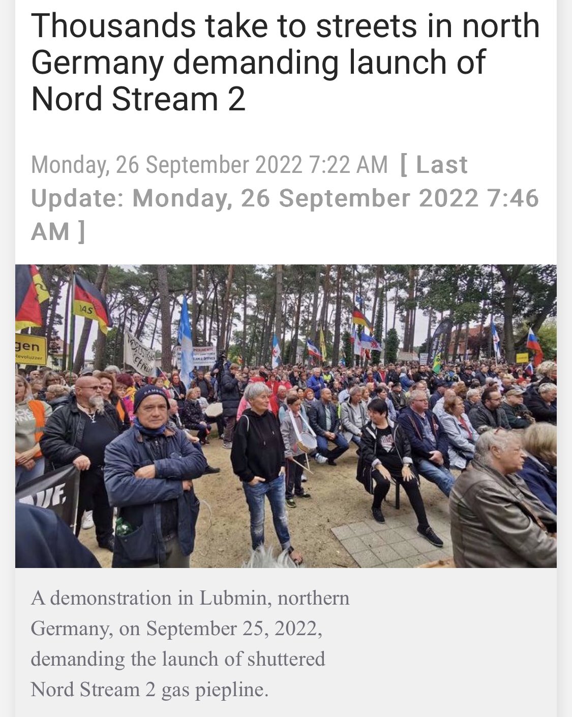 A szivárgást megelőzően a gázvezetéken keresztül történő áramlást csak az akadályozta, hogy Scholz német kancellár februárban az USA kérésére szabályozási blokkot helyezett el. A mai nap folyamán tüntetések törtek ki Németországban a vezeték megnyitását követelve. Az időzítés egyszerűen hihetetlen.