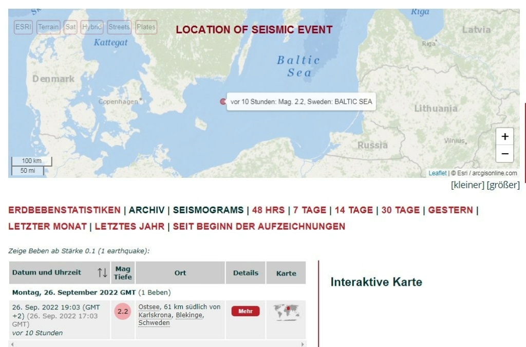 A Svéd Nemzeti Szeizmikus Hálózat két erős víz alatti robbanásról számolt be az Északi Áramlat vezetékben. Az egyik robbanás 2,3-as erősségű földrengést okozott.